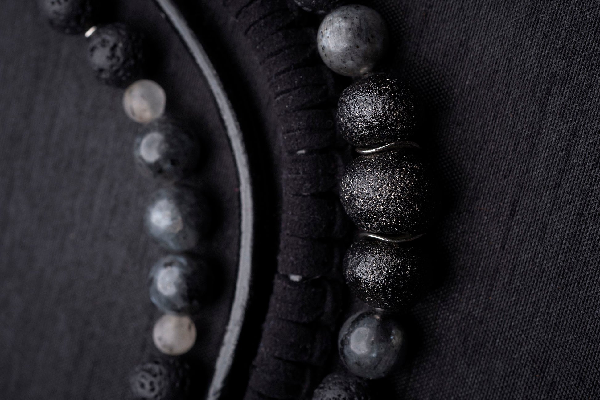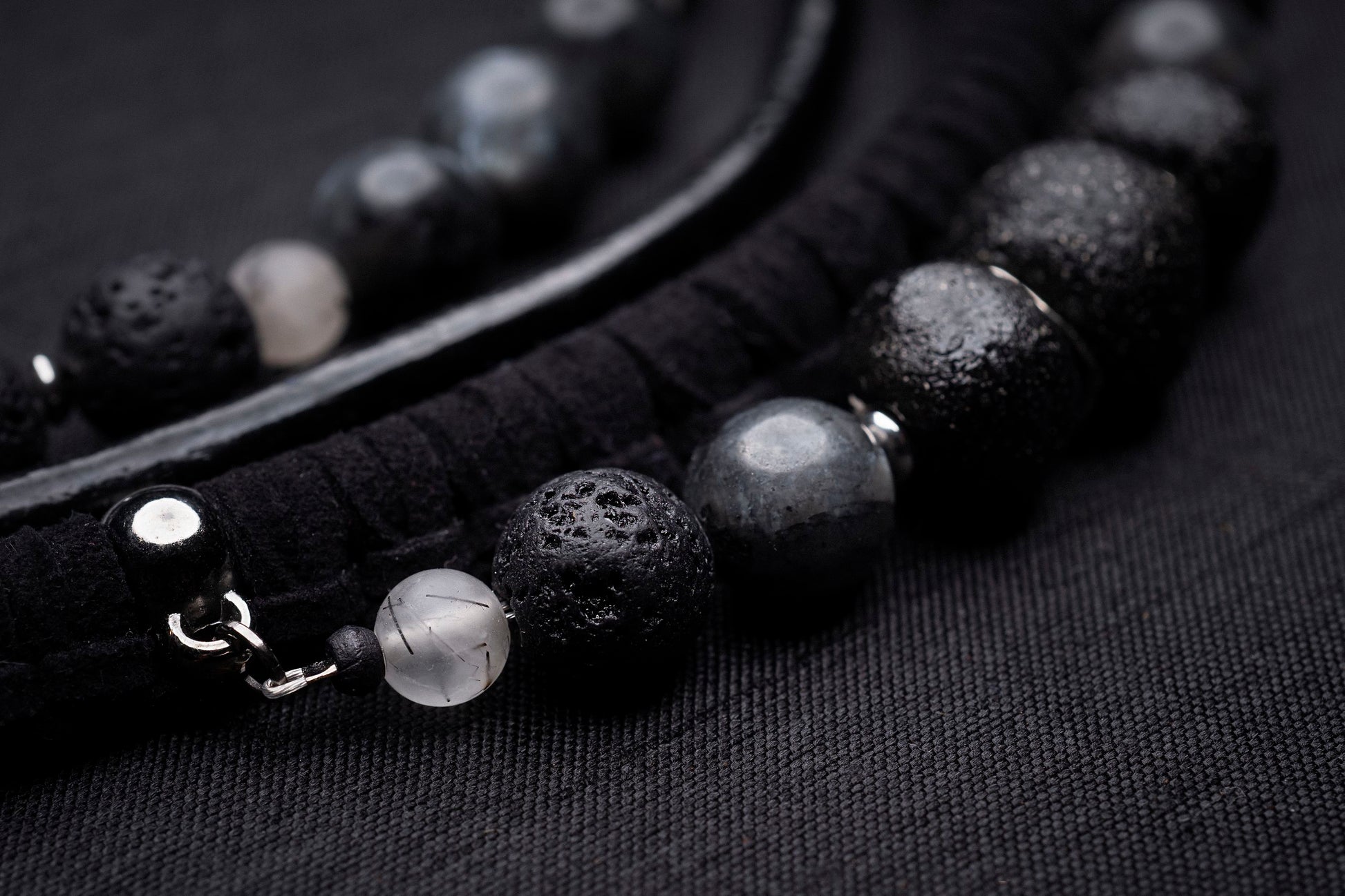 A modern statement with a handcrafted touch. This bib-style necklace features two layers of beads set with soft leather cords, creating a bold yet balanced look. The layered design adds depth and texture, making it a standout piece that instantly elevates any outfit.