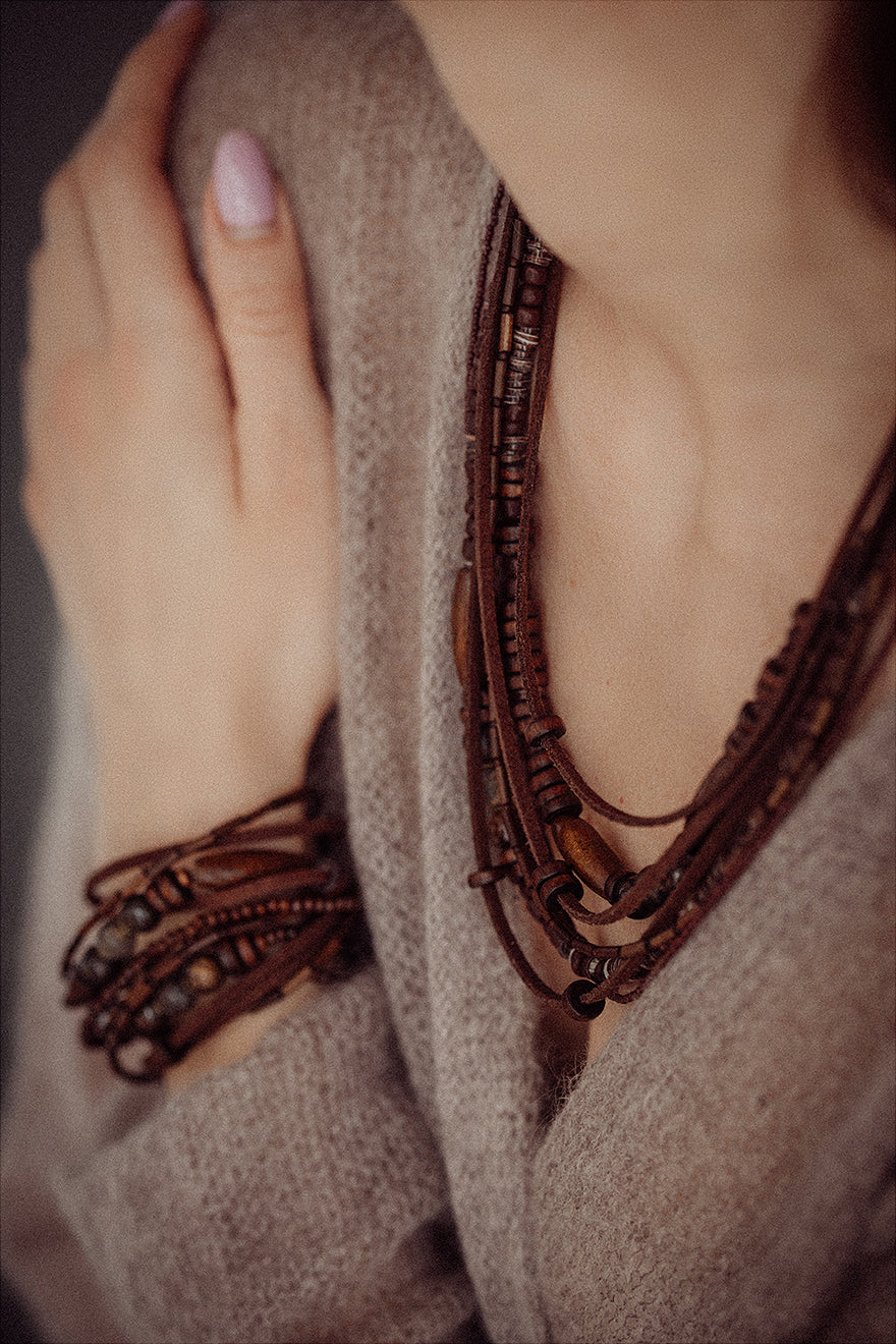 Eclectic, layered, and full of bohemian charm. This handcrafted jewelry set includes a multilayer necklace and matching bracelet, designed for those who love bold, textured accessories with a free-spirited feel.