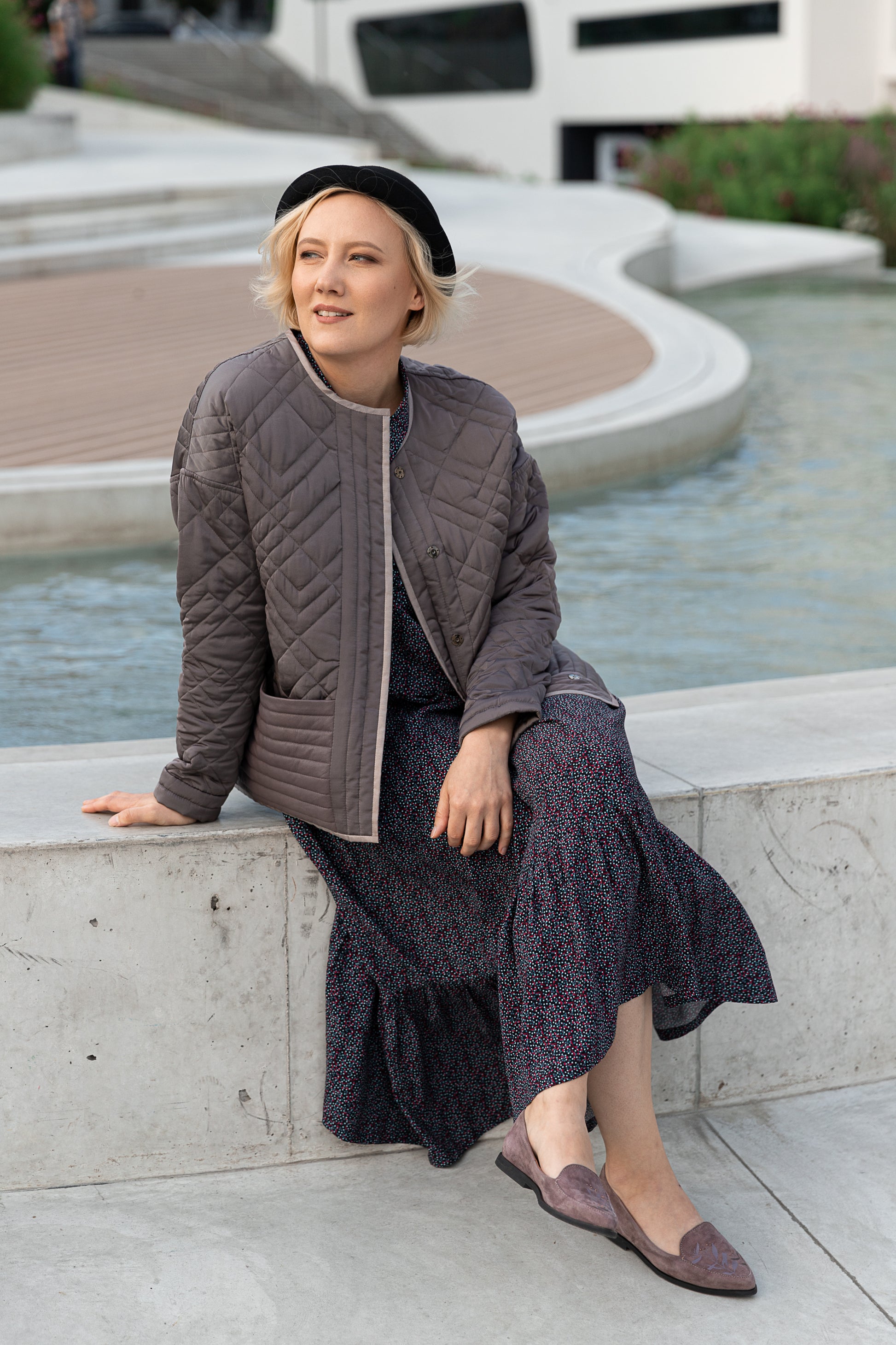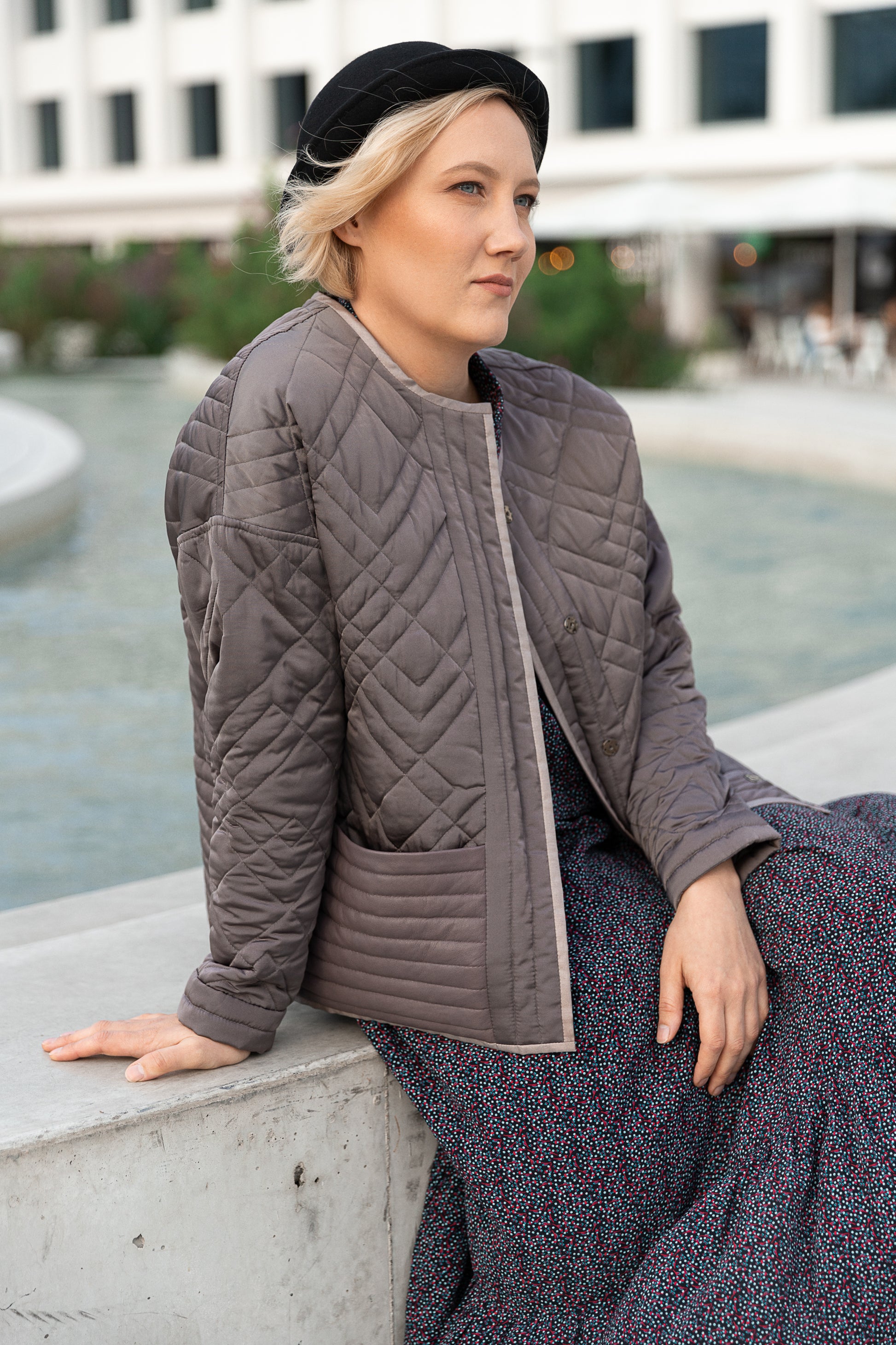 A bold, modern layer made to stand out. This bomber jacket features a geometric quilted pattern and large leather front pockets that add both function and style. The short, boxy shape and snap fastenings give it a clean, contemporary look — perfect for layering through spring and summer.